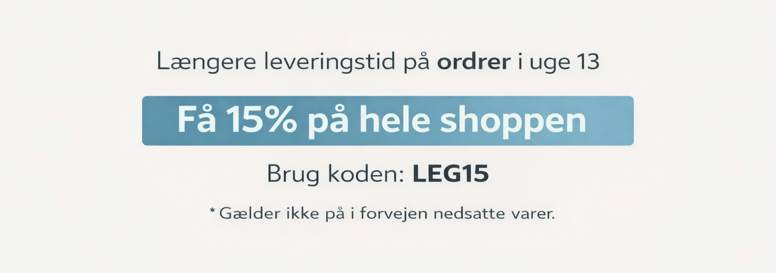 Længere leveringstid i uge 13 - SPAR 15% PÅ HELE SHOPPEN - Brug koden LEG15