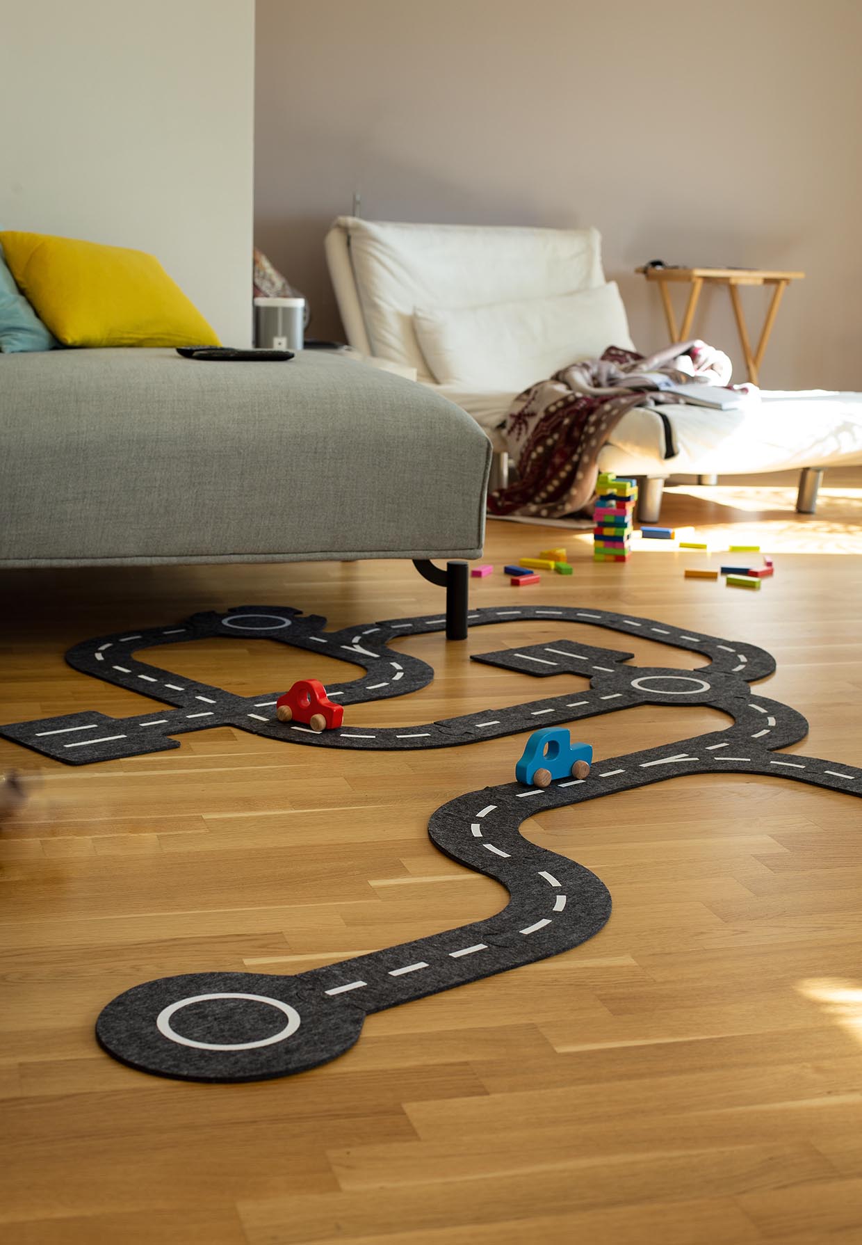 Medfølgende er to robuste træbiler i rød og blå, som kører let henover filtoverfladen. Vejbanens dæmpede mørkegrå farve gør, at farvede biler og figurer træder tydeligt frem, og filten ligger stabilt på gulvet uden at glide.